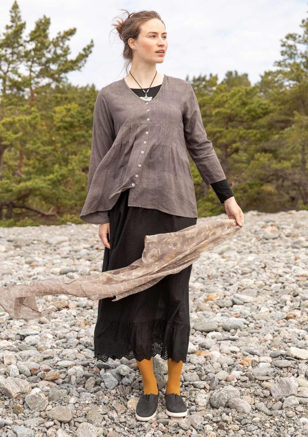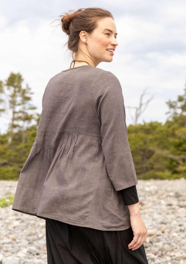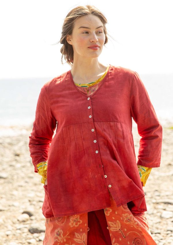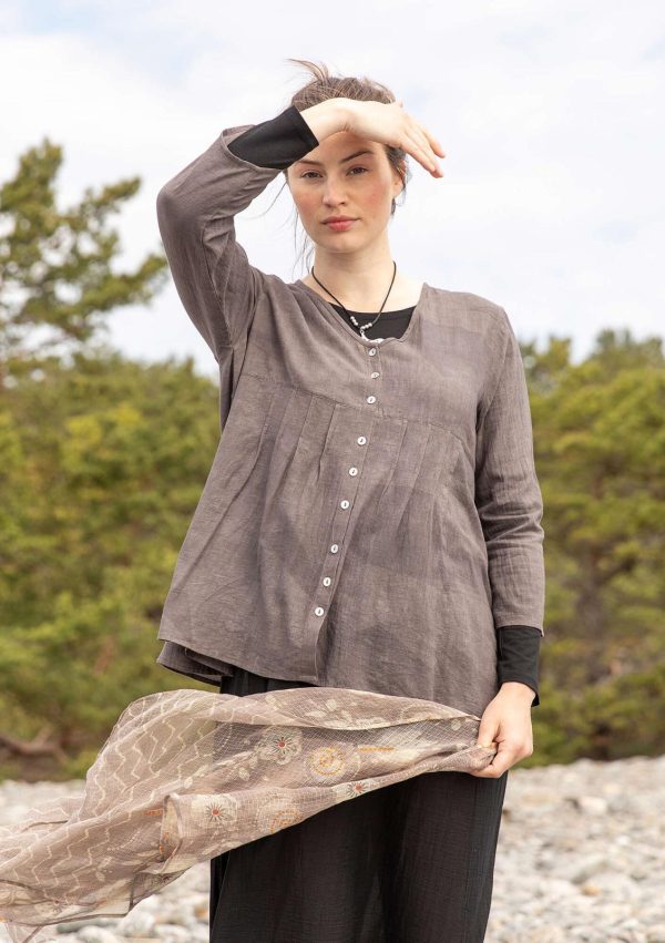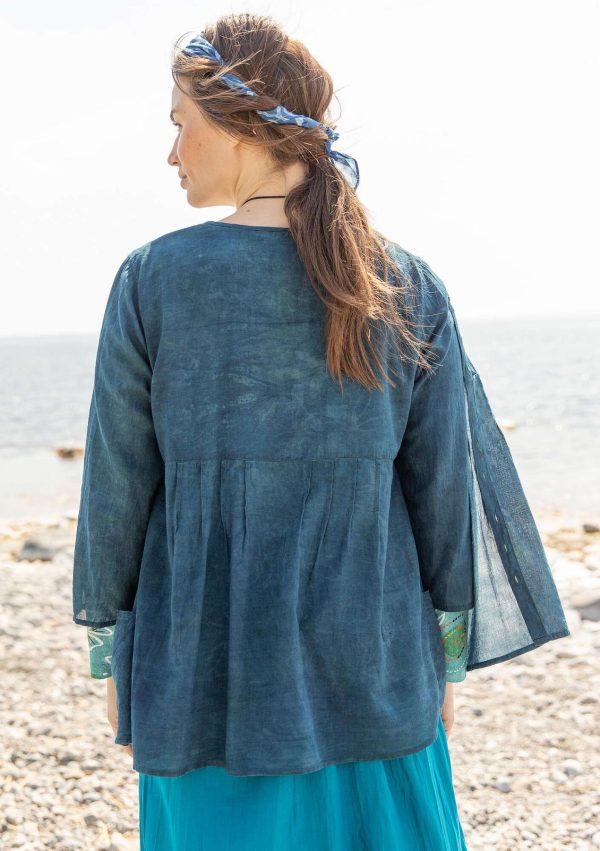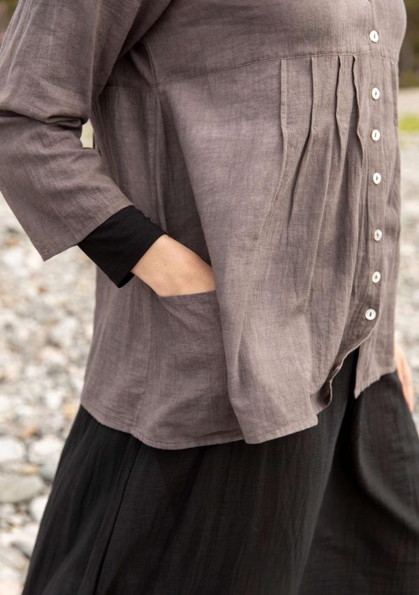 Pflanzengefärbte Bluse mit durchgehender Knopfleiste. Teilungsnaht unter der Brust, mit Biesen vorne und hinten. V-Ausschnitt, etwas längere 3/4-Ärmel und Seitentaschen.|