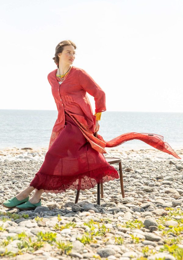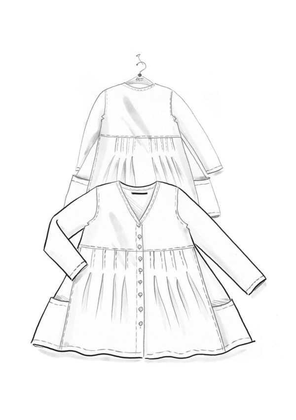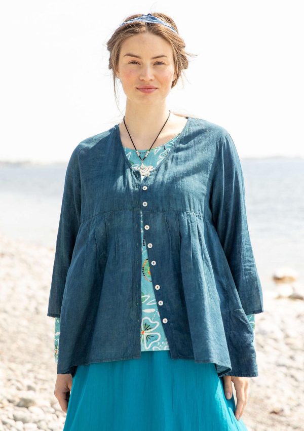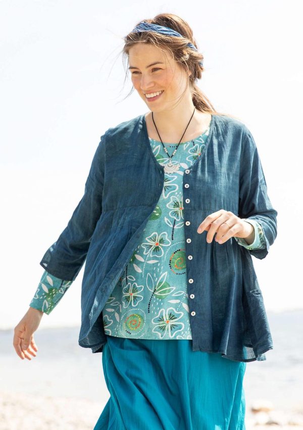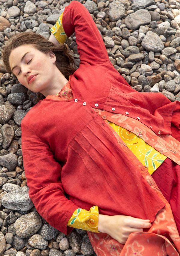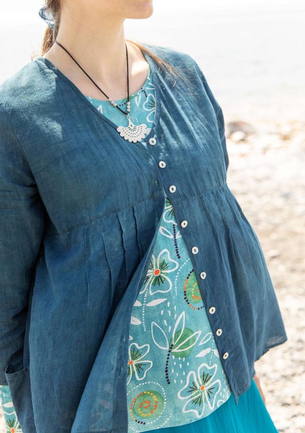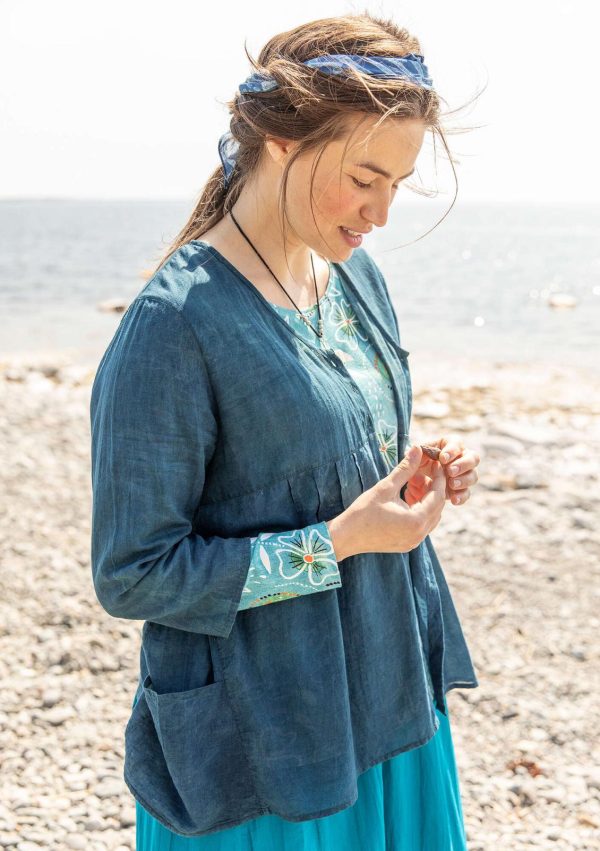 Pflanzengefärbte Bluse mit durchgehender Knopfleiste. Teilungsnaht unter der Brust, mit Biesen vorne und hinten. V-Ausschnitt, etwas längere 3/4-Ärmel und Seitentaschen.|