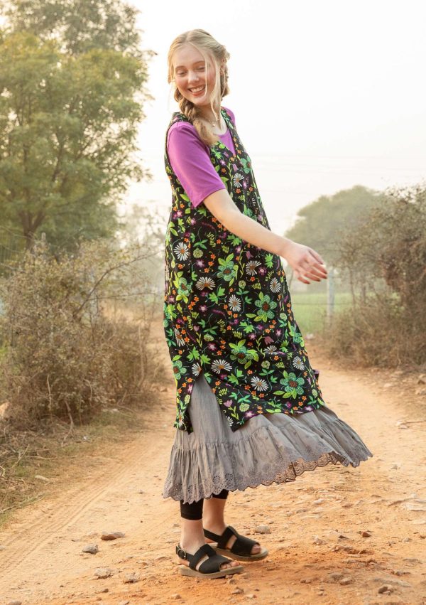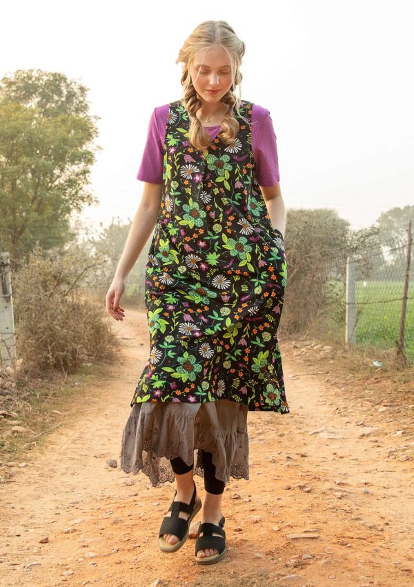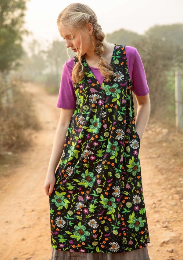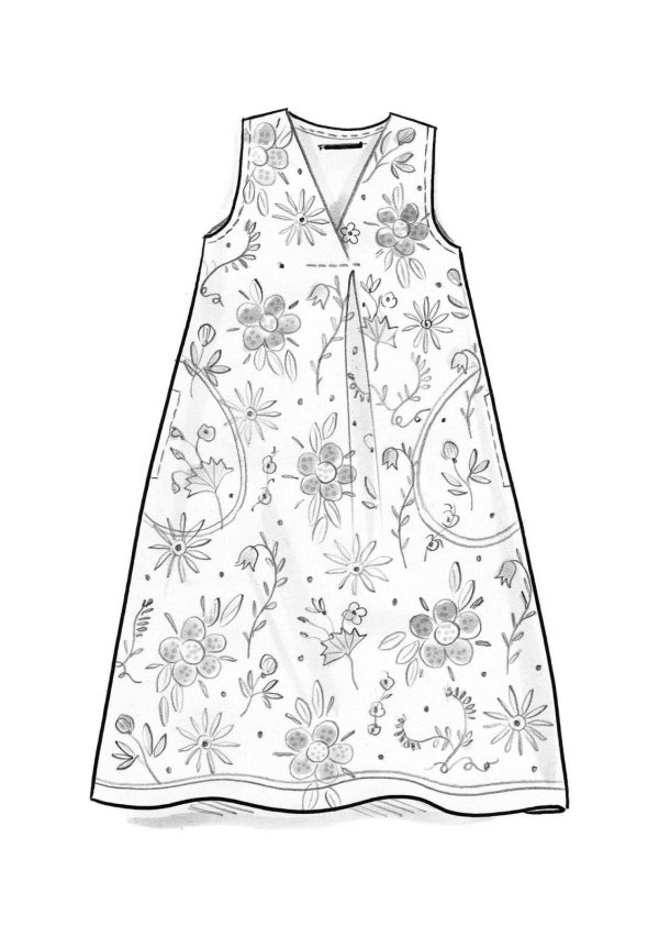 Ärmelloses Jerseykleid mit Blumenprint. Modell mit V-Ausschnitt und Kellerfalte vorne, die für eine schöne Weite und eine leicht elegante Silhouette sorgt. Seitenschlitze und Taschen in den Seiten.|