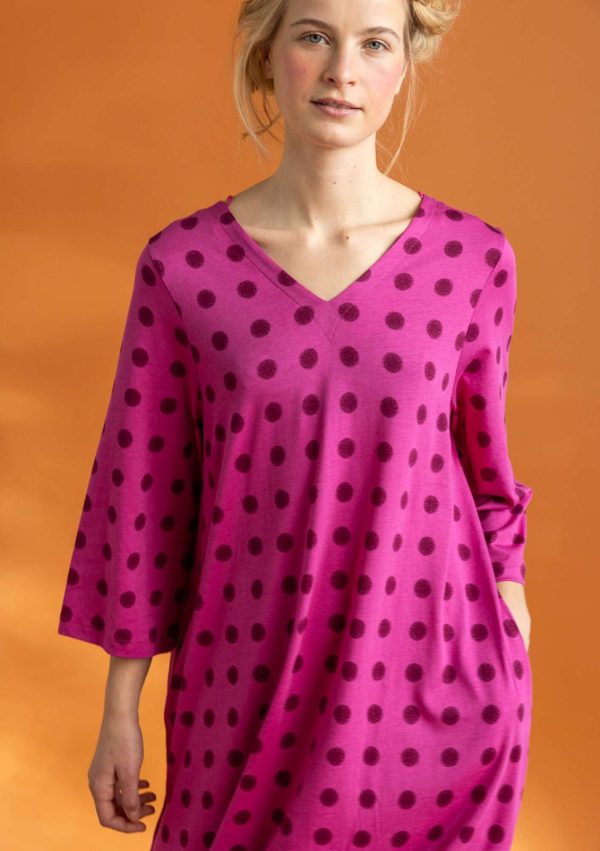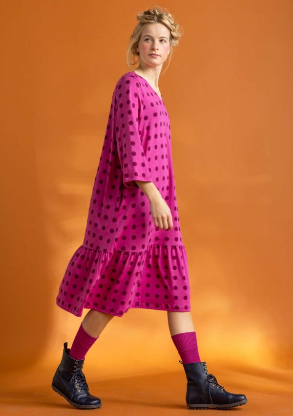 Kleid mit V-Ausschnitt und 3/4-Ärmeln. Etwas längeres Modell in A-Linie mit breitem, schwingendem Volantsaum. Praktische seitliche Taschen.|