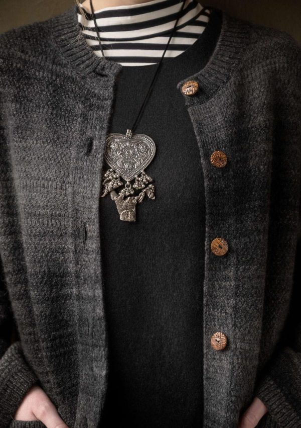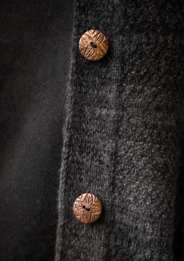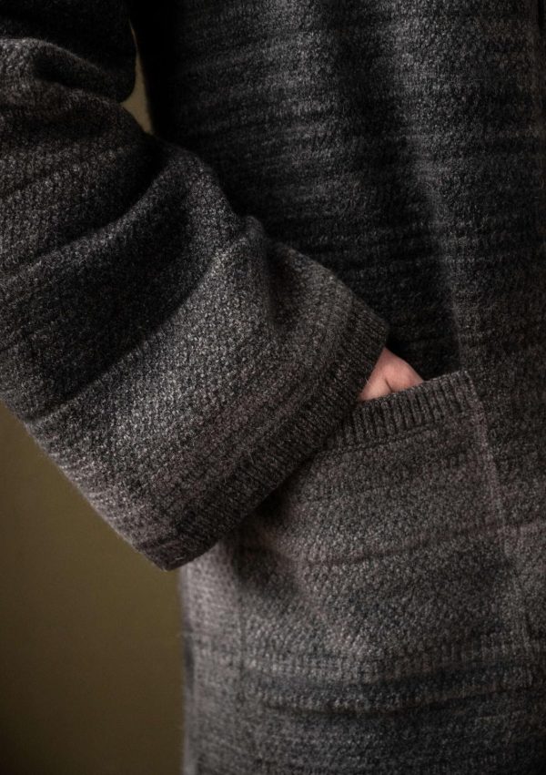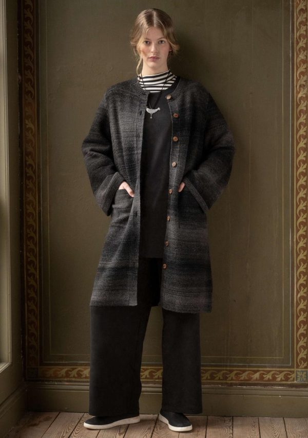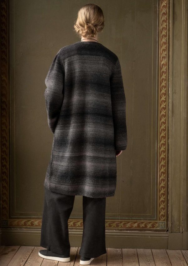 Strukturstrickjacke aus einem außergewöhnlichen, unregelmäßig gefärbten Effektgarn, das wir selbst designt haben. Dies macht jede Strickjacke zu einem Unikat, da die Streifen bei jedem Exemplar anders ausfallen. Langarmmodell mit rundem Ausschnitt, aufgesetzten Taschen und Rippbündchen. Mit Ornamentknöpfen aus Naturholz zu schließen.|