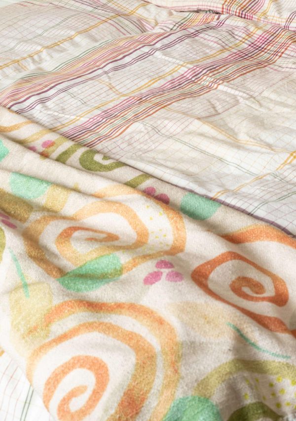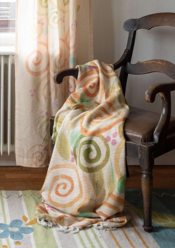 Hübsches Plaid aus handgewebter Bio-Baumwolle. Verspieltes digital gedrucktes Muster und Fransen an den Schmalseiten.|