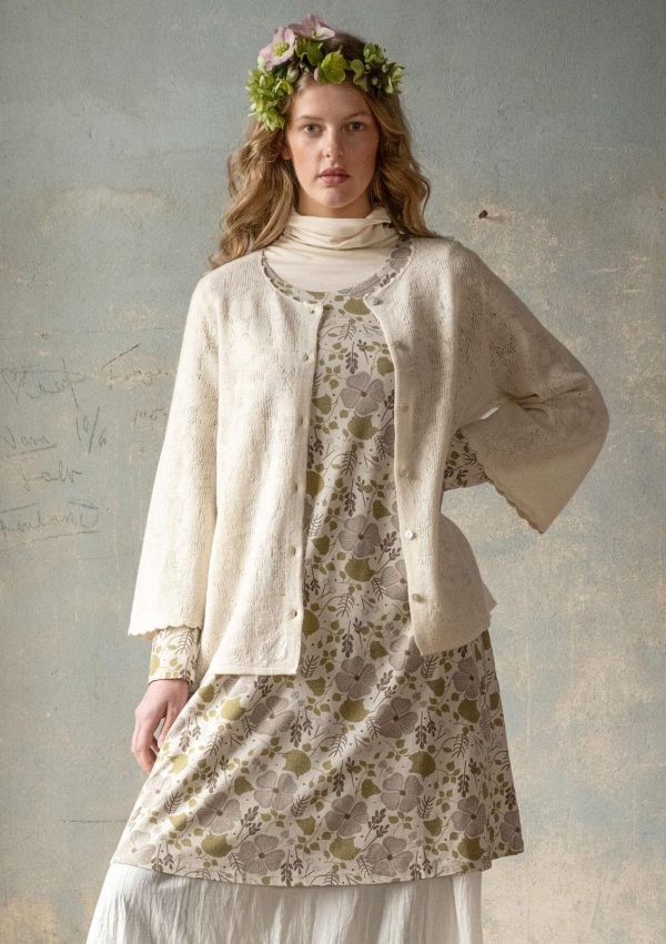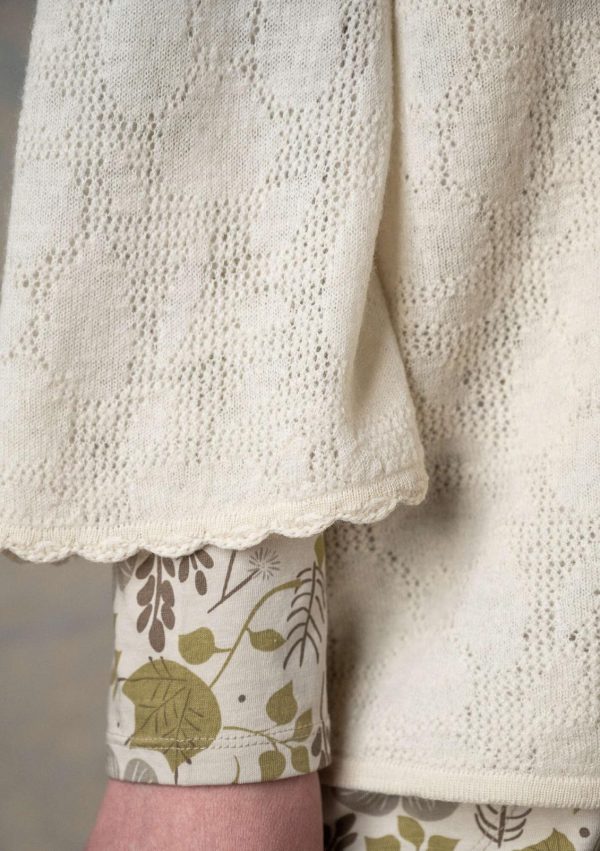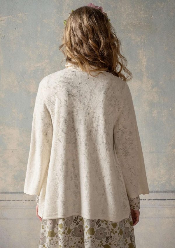 Jacke im Pointellestrick aus weicher Merinowolle. 3/4-lange Trompetenärmel mit dekorativer Strickborte. Runder Ausschnitt mit hübschen Noppen. Farblich abgestimmte Perlmuttknöpfe.|