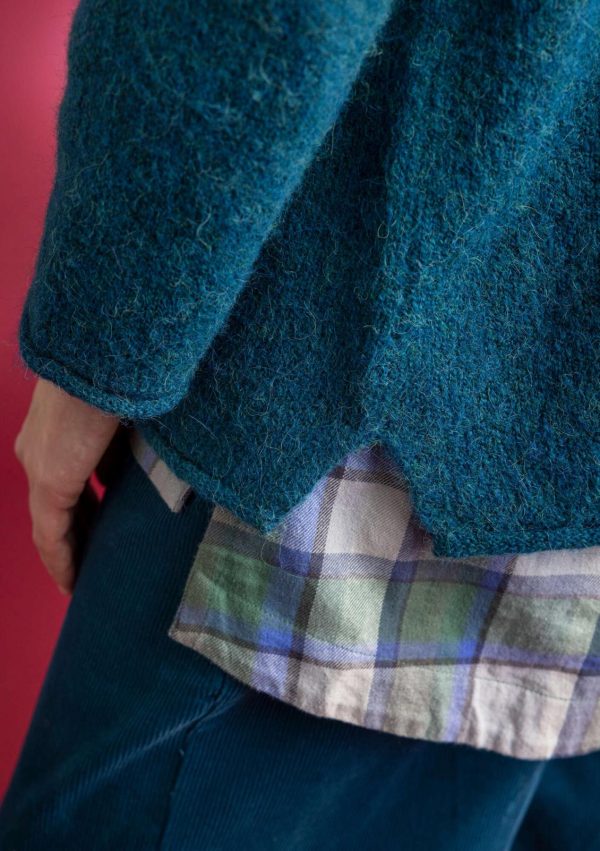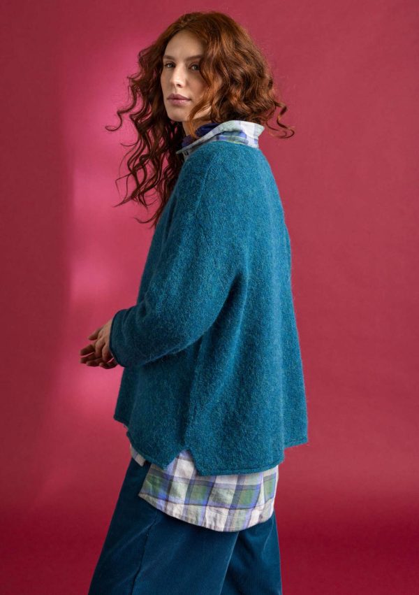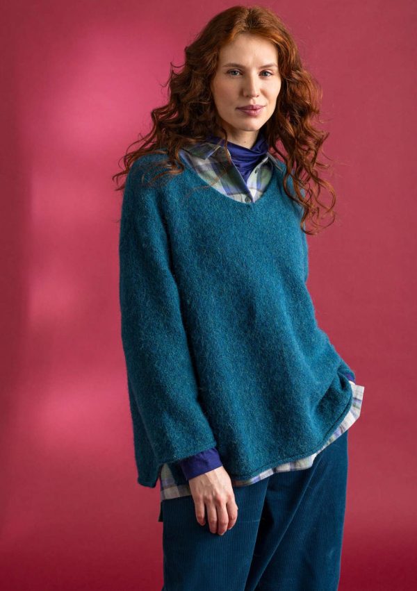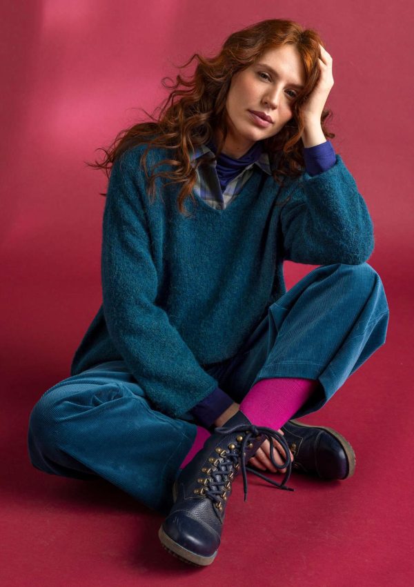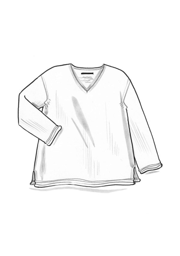 Legerer V-Pullover für behagliche Tage. Aus unserem schönen Melangegarn gestricktes Modell mit kleinen Seitenschlitzen. Feine Rollkanten an Ärmelabschlüssen und Saum.|