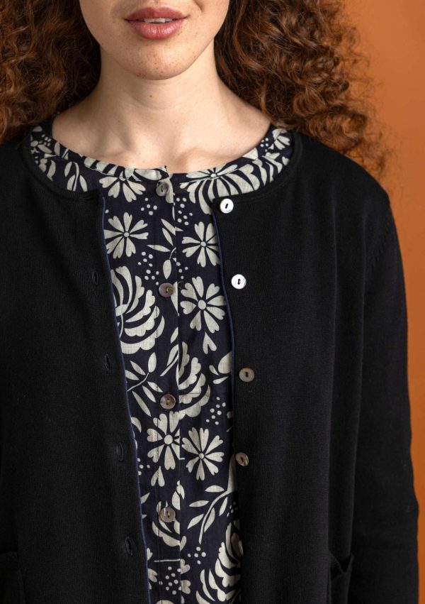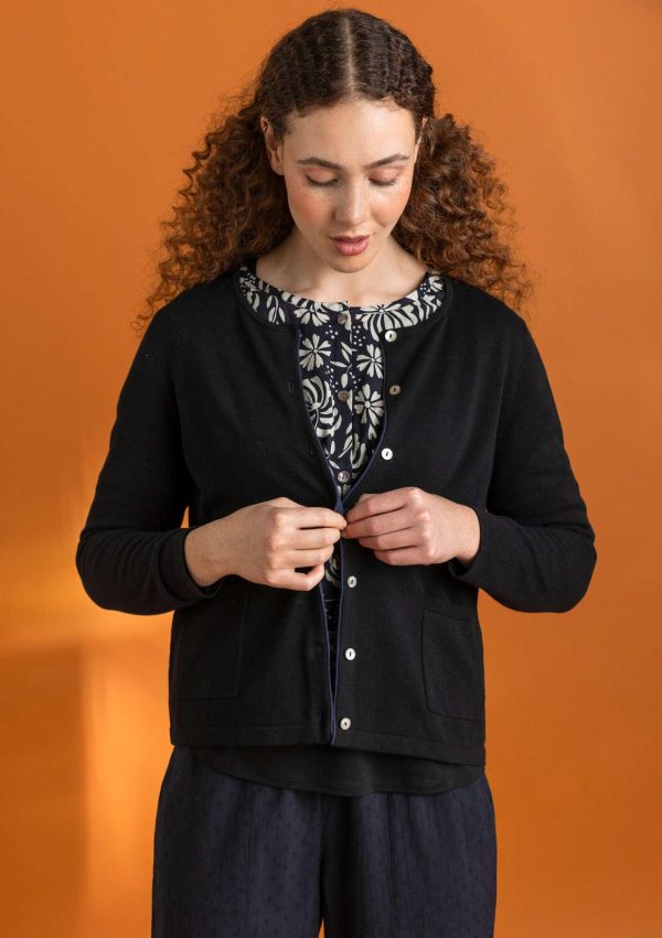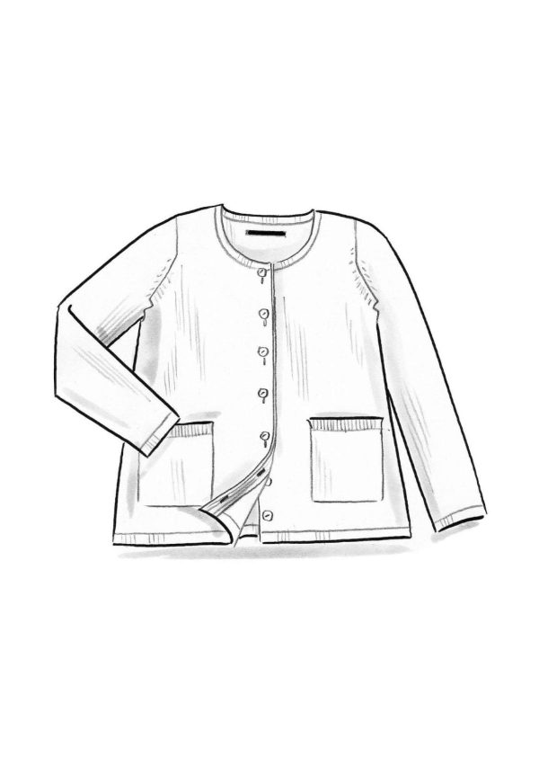 Schlichtes, kombifreudiges Modell mit langen Ärmeln. Hübsch kontrastierende Rollkante vorne und als Akzent auf der Sauminnenseite. Zwei praktische Taschen mit Rippblende am Eingriff. Perlmuttknöpfe.|