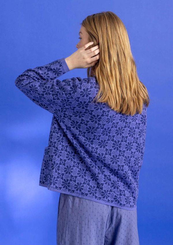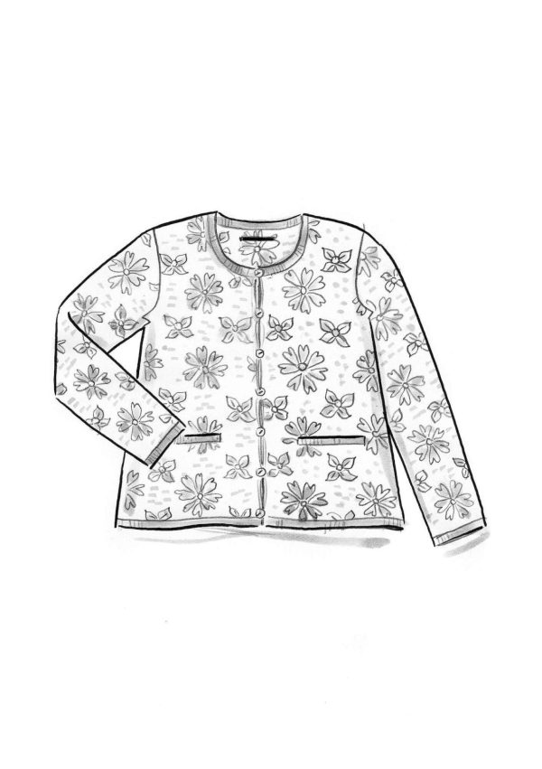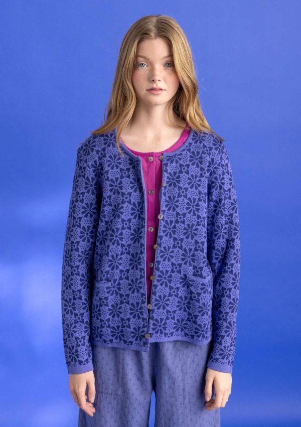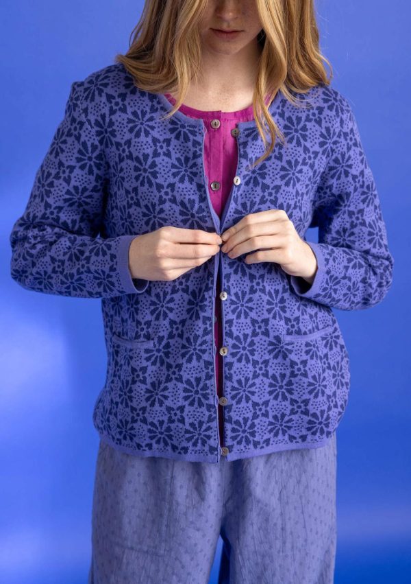 Jacquardstrickjacke mit langen Ärmeln. Grafisches Blumendessin mit Folklore-Charakter. Perlmuttknöpfe und Häkelösen vorne, für einen hübschen Musterübergang in der Mitte. Zwei Taschen vorne.|