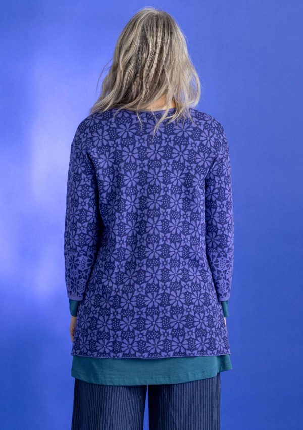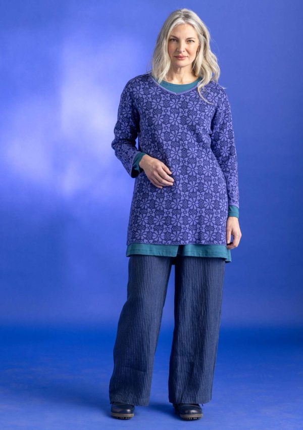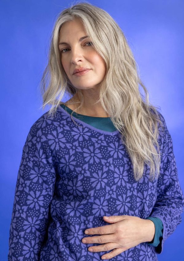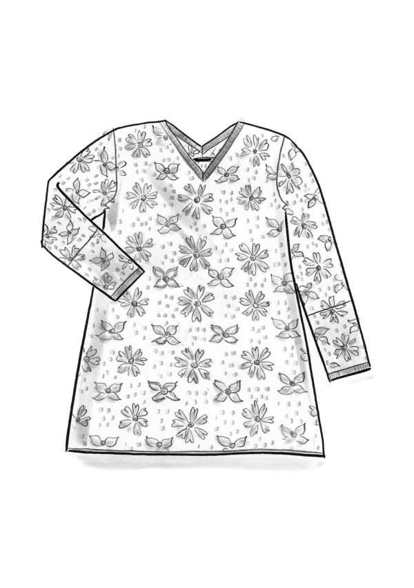 Jacquardstrick-Tunika mit leicht verkürzten Ärmeln. V-Ausschnitt vorne und hinten. An den Ärmeln Blenden in vertauschten Farben, die wie eine dezente Bordüre wirken.|