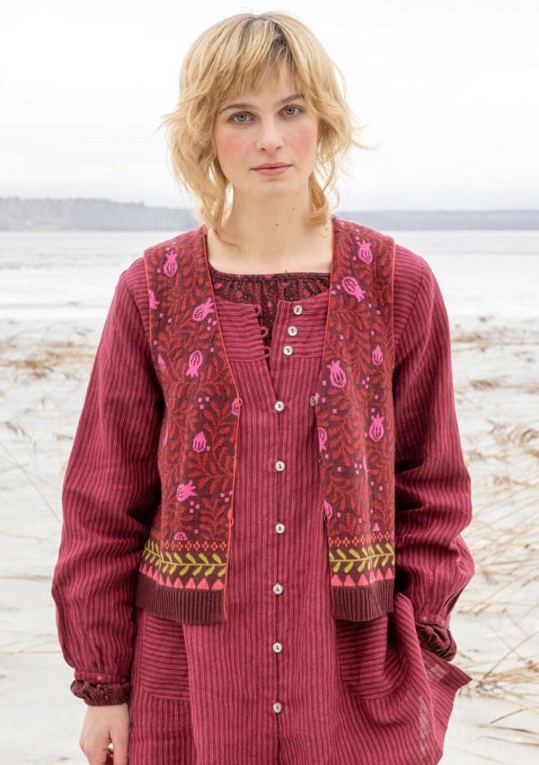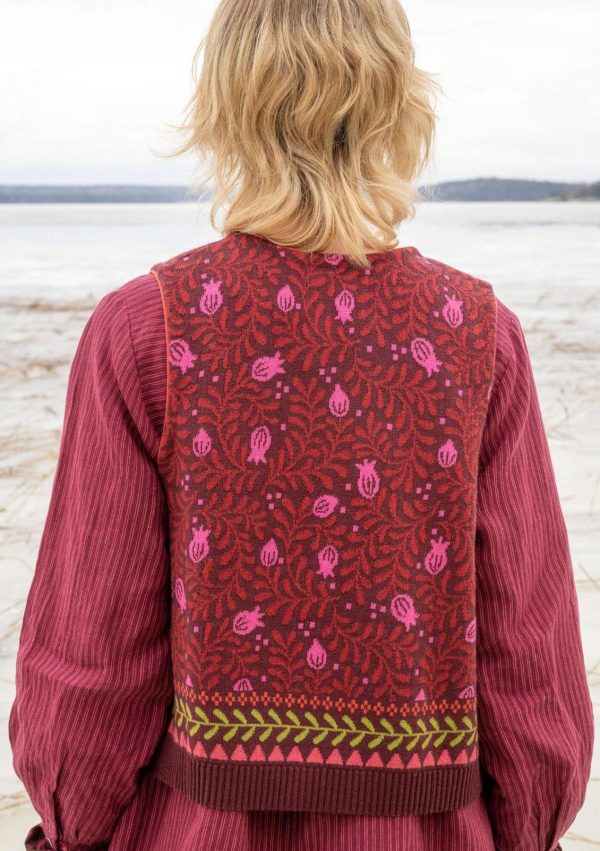 Jacquardstrickweste mit V-Ausschnitt, durchgehend mit Perlmuttknöpfen zu schließen. Hübsch gemustert mit Blattranken und dekorativen Bordüren. Rippblende am Saum.|