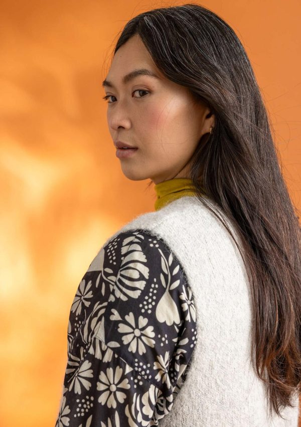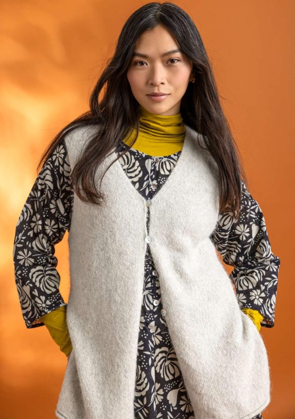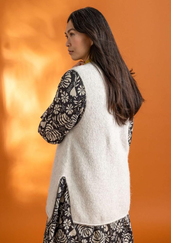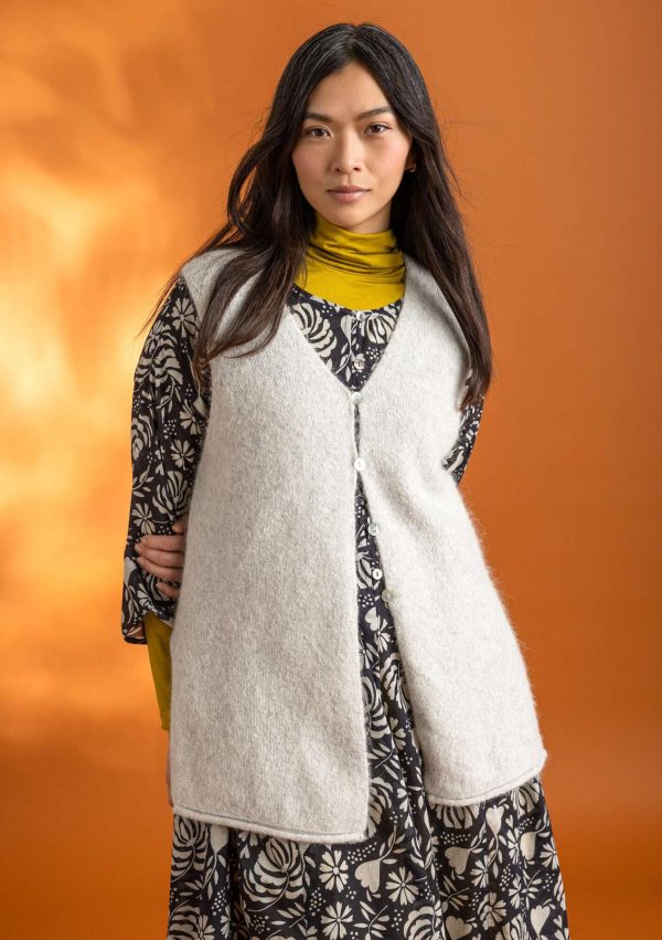 Etwas länger geschnittene Strickweste. Modell aus unserem weichen, flauschigen Melangegarn. Perlmuttknöpfe mit Häkelösen vorne und Schlitze an den Seiten.|
