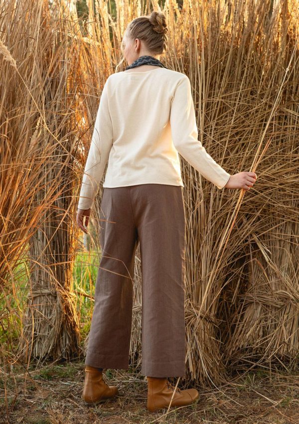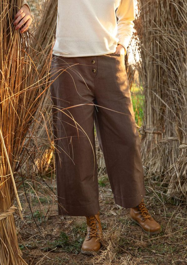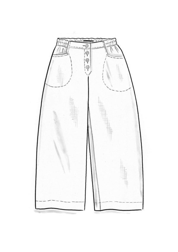 Bequeme Hose im Workwear-Stil. Modell mit leicht verkürzter Beinlänge und innen liegendem Gummizug seitlich und hinten im Bund. Bequeme eingesetzte Taschen und melierte Knöpfe vorne.|